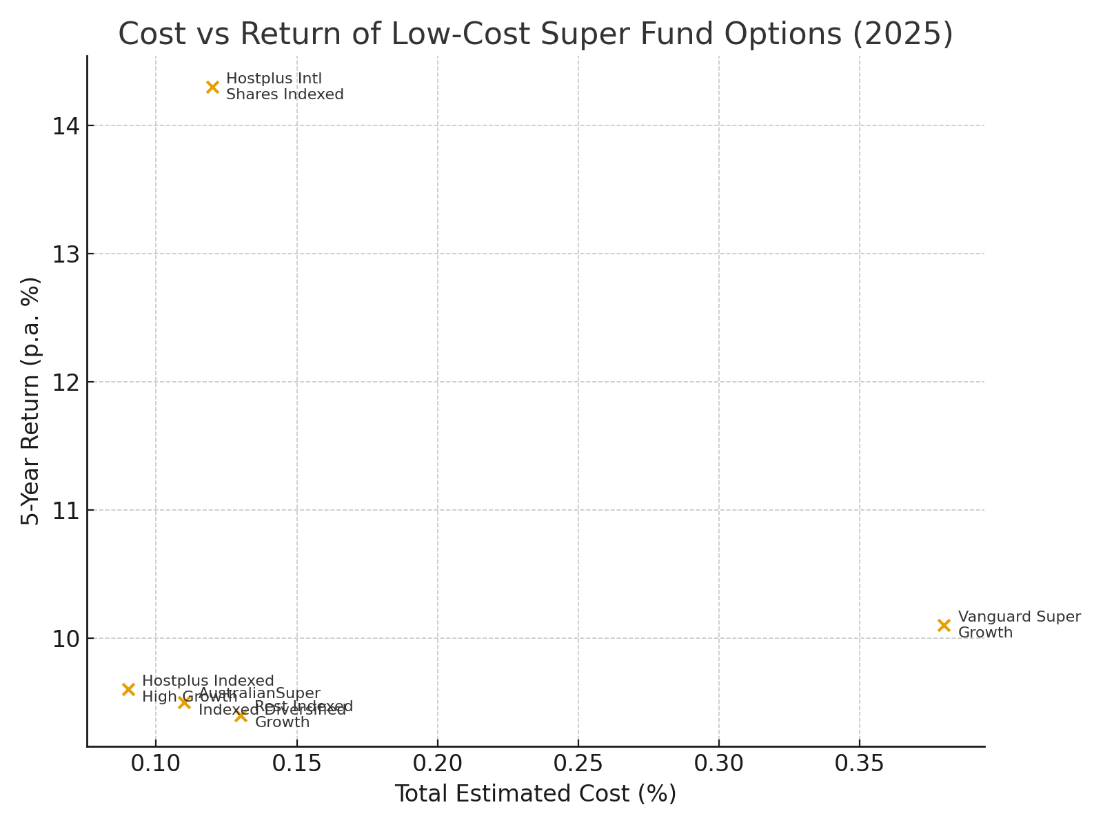 - Hostplus Indexed series remain the fee leaders: total annual costs under ~0.10% to 0.12% plus the $78 admin fee.