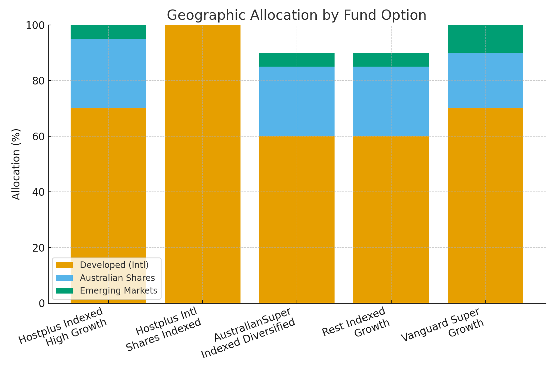 - Rest and AustralianSuper have a stronger Australian equity component (~25%) than the pure international options.